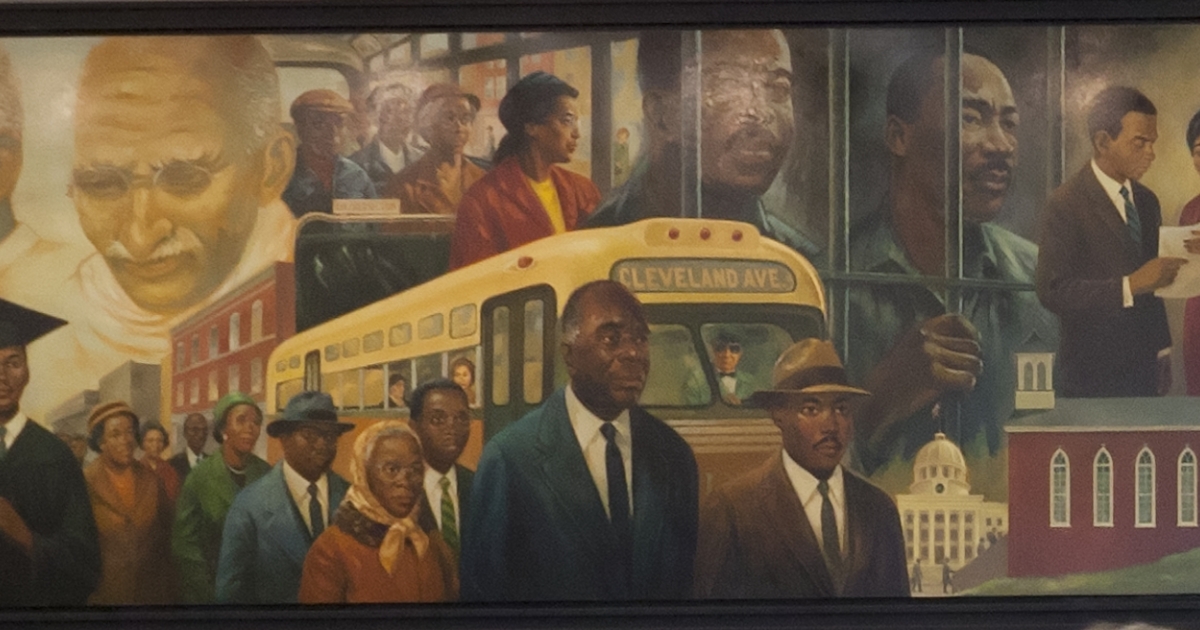Top and bottom photos: Detail from artist Don Miller’s mural in the Martin Luther King Jr. Memorial Library, District of Columbia Public Library; Carol M. Highsmith Archive, Library of Congress.