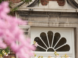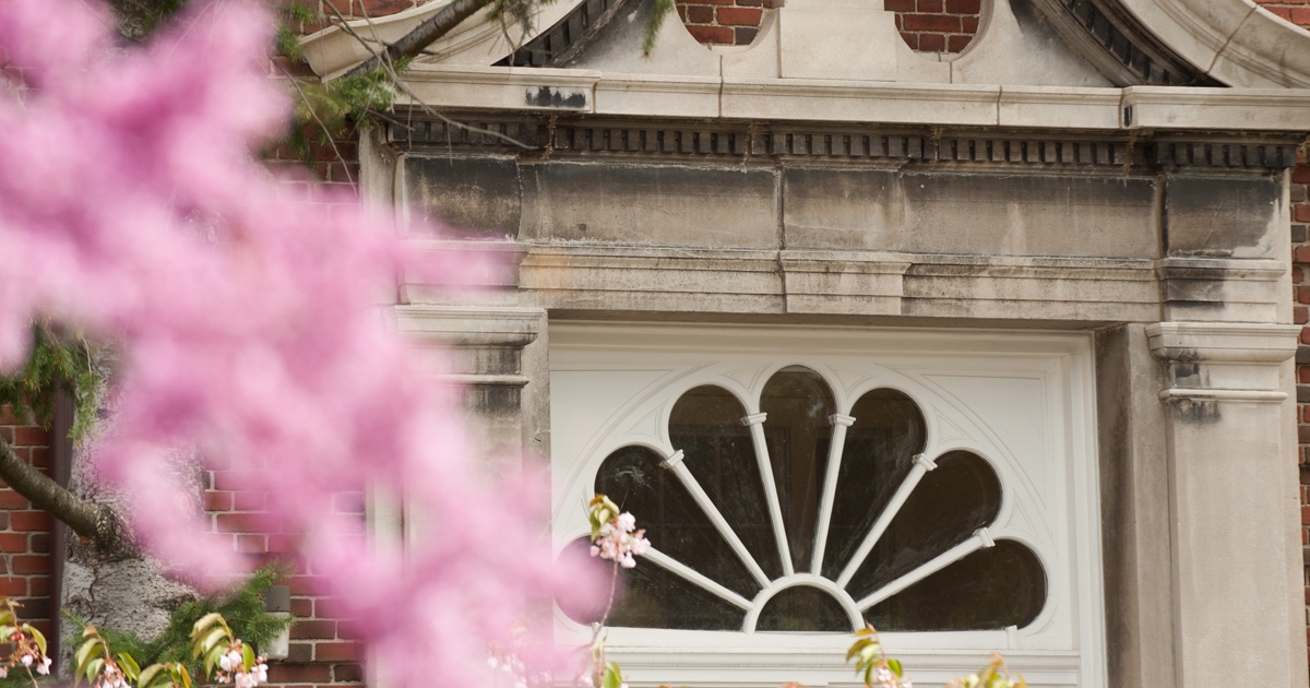Bacon Hall window with spring blossoms
