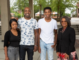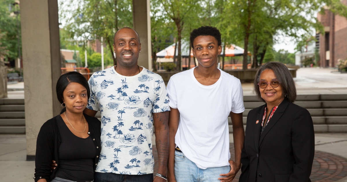 Jeremiah Simon standing with  his parents and President Katherine Conway-Turner