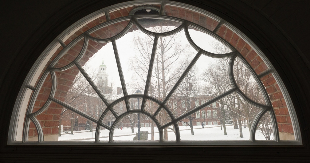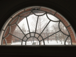 Close up of arched window in Ketchum Hall looing out on snow-covered campus