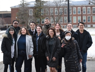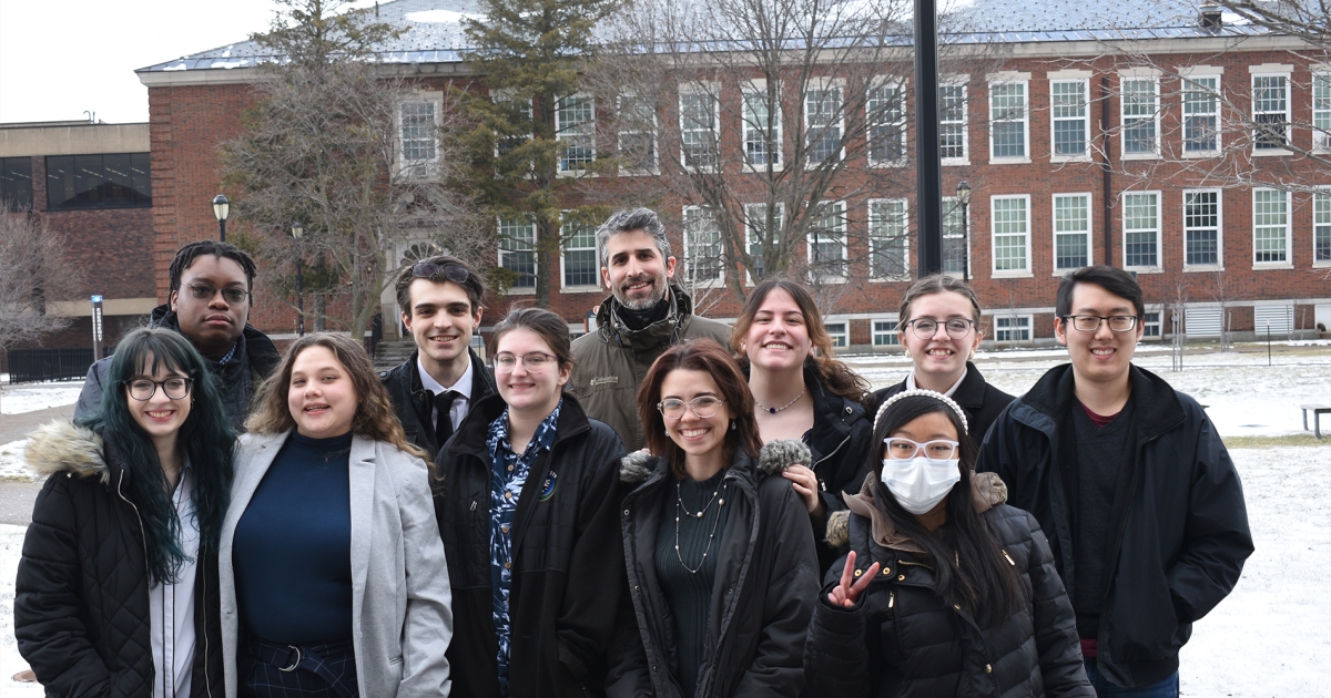 Members of Buffalo State’s Mock Team include, from left (front row): Maddi Crosby, Dom Zirpola, Mimi Byrne, Grace Gallagher, Cait Malilay. (back row): Jerick Flores, John Quinane, coach David Ben-Merre, Jillian Tung, Lindsey Roth, and (cropped in) visiting coach Vincent Bai.