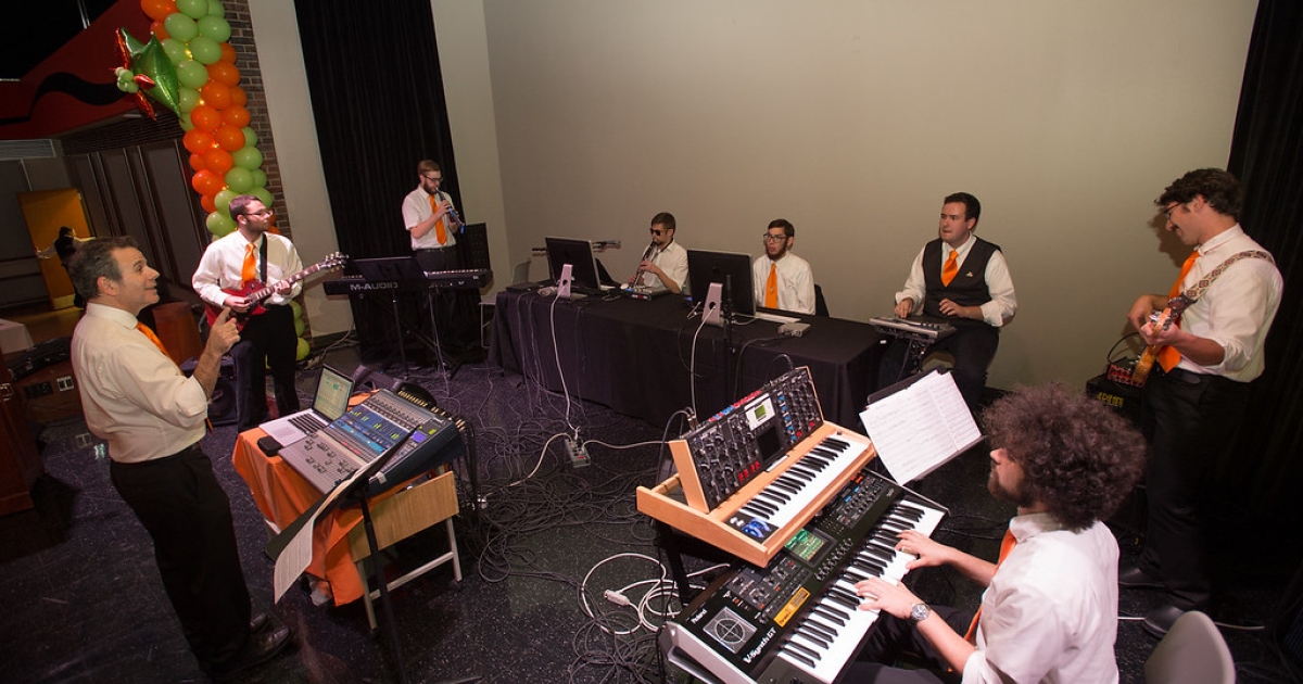 Pictured top: Buffalo State's Digital Music Ensemble, led by Tomás Henriques (left), performing at the Transforming Lives Campaign closing ceremony celebration at Buffalo State College in 2015