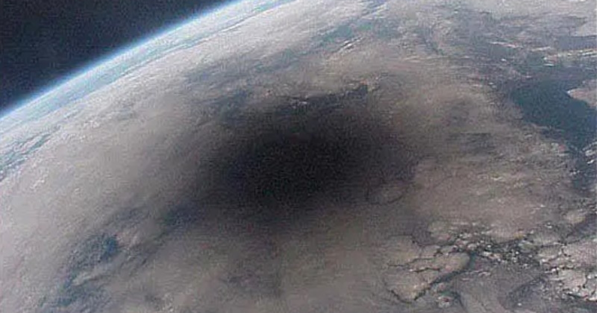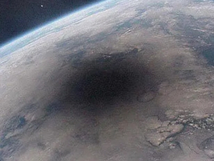 Pictured top: The Moon’s shadow on Earth during a solar eclipse.