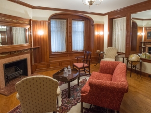 The rooms preserve the solid cherry interiors of the library and dining room, and also include the rooms’ intricate fireplaces and mantels, as well as the original ornate trim work. Despite being in a boarding house for over 55 years, the woodwork was in good shape, Kowsky said, but it needed to be cleaned of a layer of white paint. Buffalo State’s Art Conservation Department helped with this.