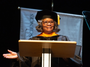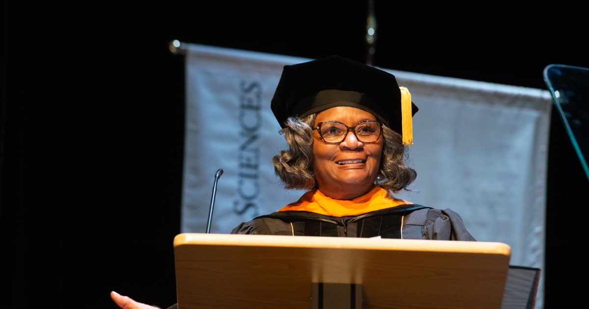 Pictured: Interim President Bonita R. Durand, Ph.D., addresses the Class of 2028 at First-Year Convocation.