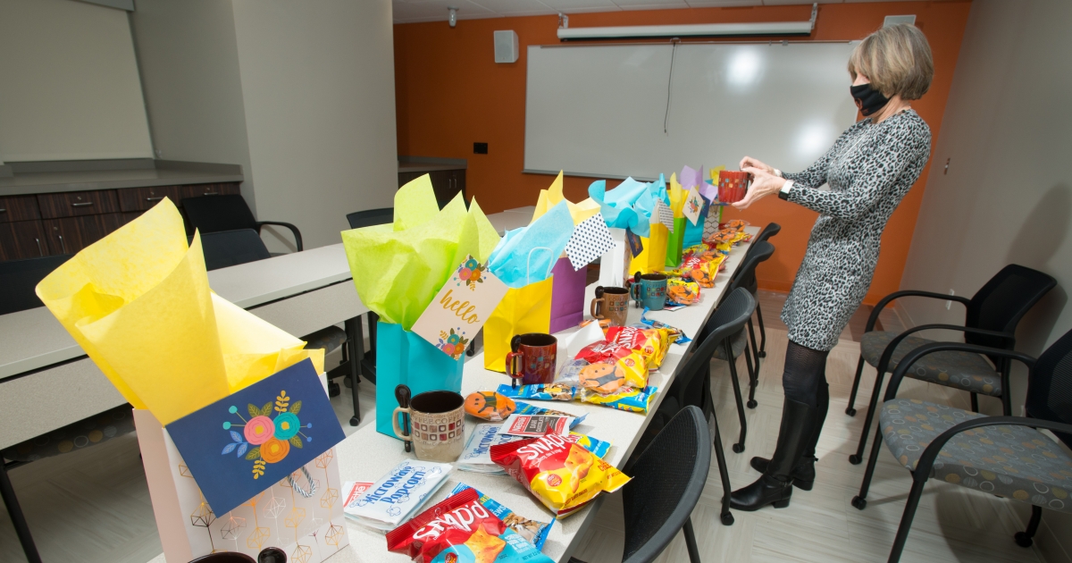 “I was in a meeting with some people from Student Affairs, and they were talking about how a student was waiting for a care package from home, and the package, through no fault of the college, was delayed,” she said. “It made me think of when I was in college, how my aunt and uncle sent me care packages all the time. I thought, why couldn’t we be their family while they’re here and deliver these time-efficient gift bags?”